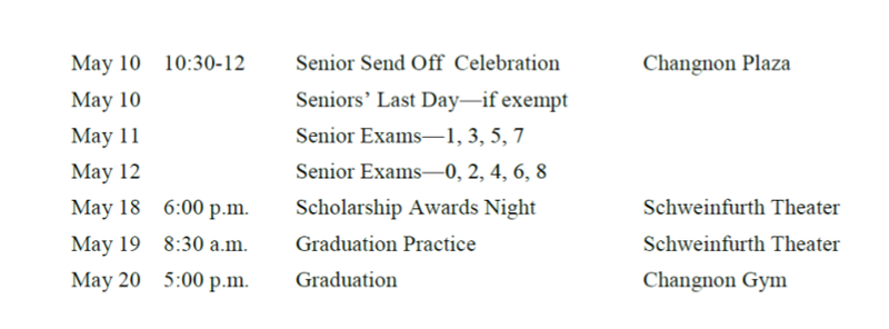 The Scholarship Awards Program will be held on Thursday, May 18, at 6:00 p.m. in the Schweinfurth Theater. You will receive a separate letter if your senior will be recognized at the Awards Program.