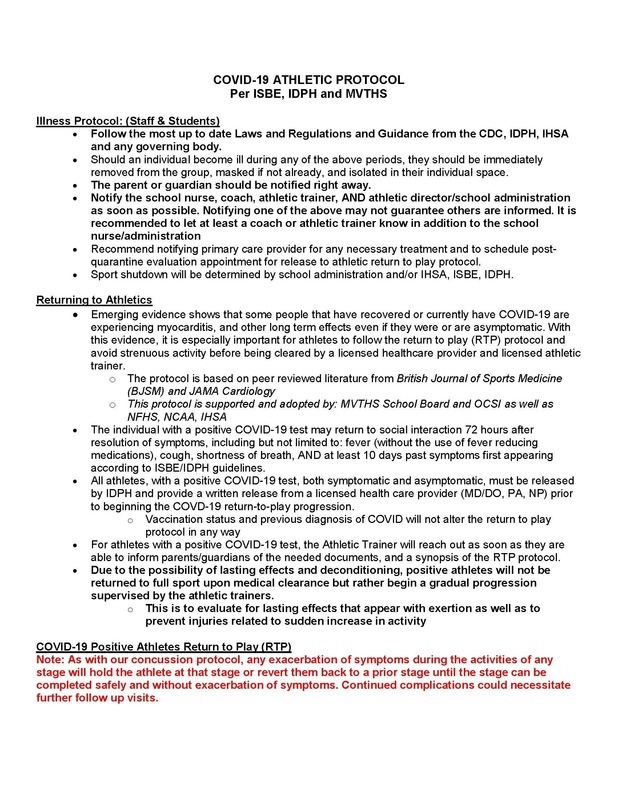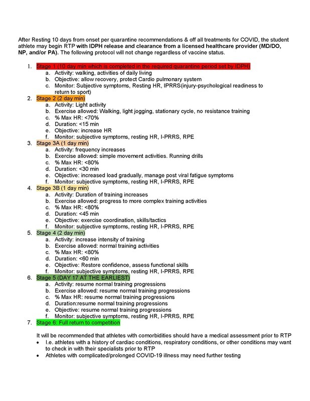 Given all the recent changes in COVID protocols lately, the athletic trainers would like to remind everyone of the return to play progression required of all student athletes that test positive for COVID. The return to play progression has not changed at all. Vaccination status and previous diagnosis of COVID do not alter a student athlete's requirements in regards to athletics. We still require each athlete to be seen by an MD/DO, NP, or PA for a post-COVID clearance to begin this progression with the athletic trainers. If you would like a form to take with you as a doctor's note, they are available in the athletic training room. This is all done with the athletes best interest in mind and is based on the most up-to-date recommendations in our field.